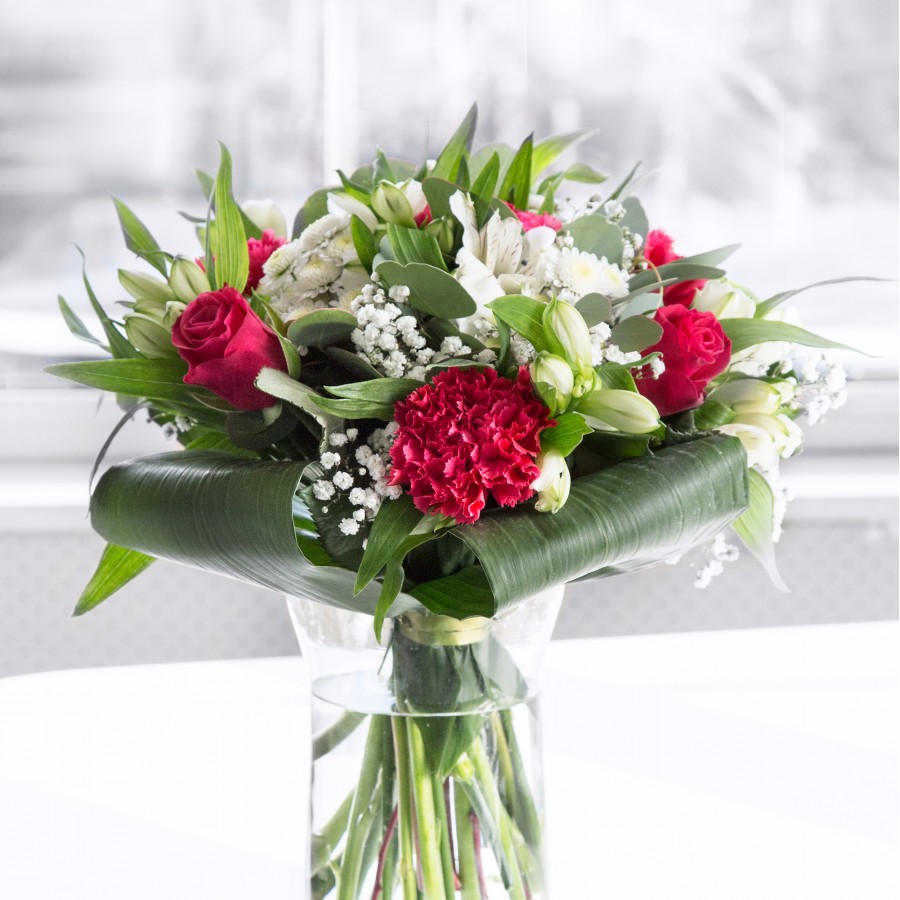 Discover the unique charm of our beautifully arranged bouquet. Featuring a stunning mix of white chrysanthemums, delicate gypsophila, vibrant red roses, and elegant carnations, perfectly complemented by white alstroemeria and lush aspidistra leaves.